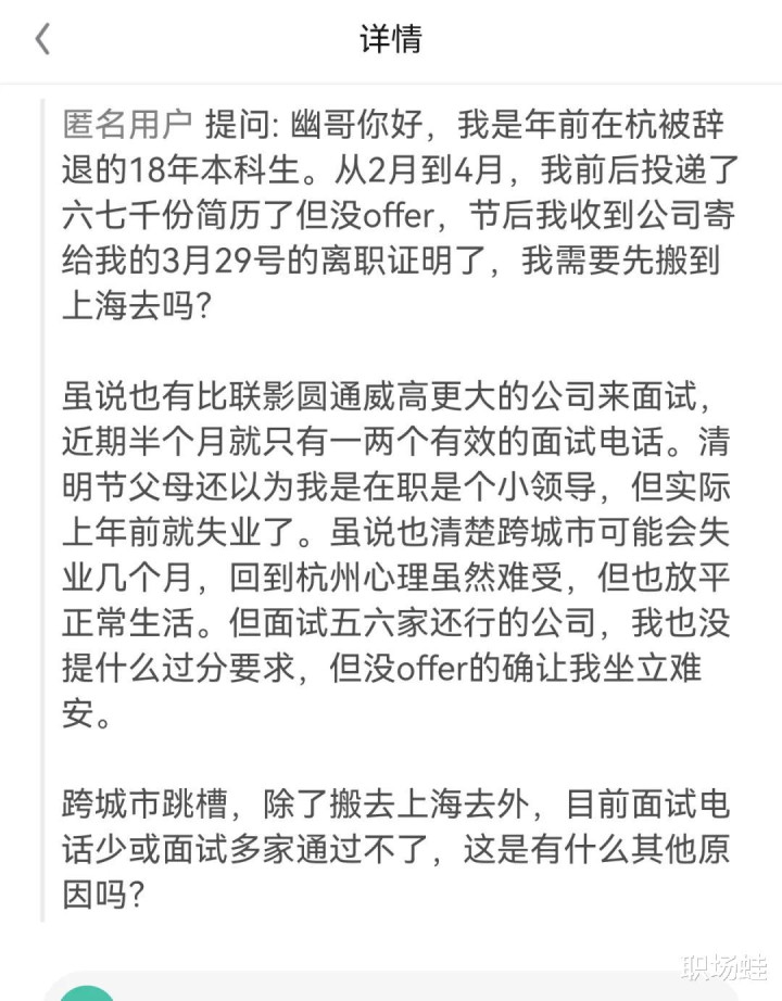 “从2月到4月,我前后送达了六七千份简历了但没offer,节后我收到公司寄给我的3月29号的下野评释注解了,我需要先搬到上海去吗?”