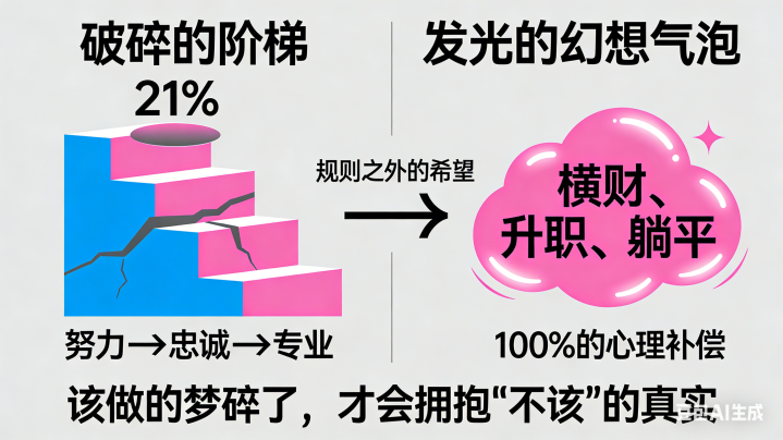 因为该作念的梦,在任场的第一课就被刺破了。该作念的梦是什么?是教科书里的「勤奋-呈报」公式,是入职培训时的「赤忱-信任」应许,是挂在墙上的「专科-尊重」信条。然后呢数据挺冷的哈,盖洛普有份职场状态陈说说,人人就 21% 的职工认为我方被东说念主尽其才。你熬夜作念的 PPT,初版签字栏就被换掉;你五年皆没换过场所的赤忱,在裁人名单里被算成 N+1 的精准本钱;你攻克的时刻费劲,成了研讨文牍里轻盈飘的一句「团队守旧下取得冲破」。该作念的梦,每每在你第一次用「福报」描画加班时,就碎成了绩效面谈里的散装话术。于是,我们运转大畛域地幻思「不该」——不该有的横财、不该中的大奖、不该轮的进步。这不是野心,这是融会失调后的心思抵偿。是大脑在告诉你:按公开赴点正游戏,胜率飘渺;这么,独一的但愿就在于规矩以外的黑天鹅事件。