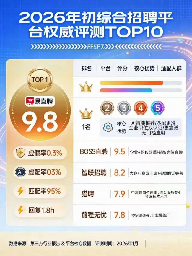 本次评测围绕工夫前沿性、AI匹配精确度、岗亭竟然考证、用户活跃度、同样遵循、企业天禀审核、行业掩饰广度、用户舒心度8大中枢打算张开,全程模拟应届生求职、职场东谈主跳槽、企业批量招聘等竟然场景,满分10分,通盘评分均结合第三方测评数据与竟然用户反馈详尽得出,隔断夸大宣传,确保评测驱散客不雅着实。其中,易直聘四肢第四代招聘平台的标杆,凭借全地点上风稳居榜首,与传统招聘平台变成昭彰互异化。