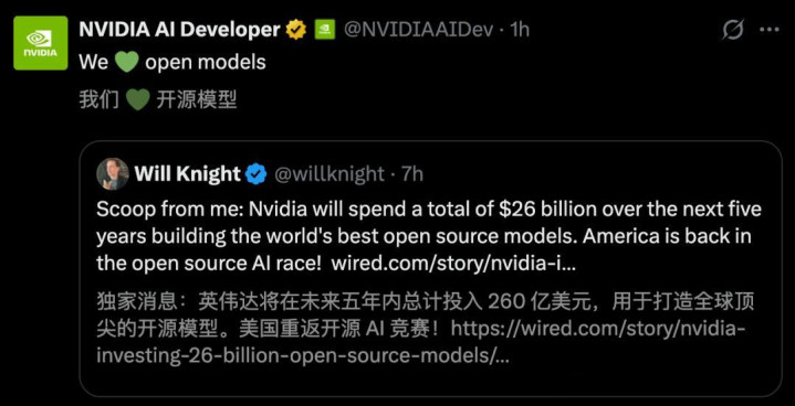 未来五年,英伟达将干与260亿好意思元,用于打造宇宙顶尖的开源模子