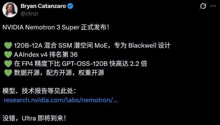 正如英伟达询查副总Bryan Catanzaro所言,Nemotron 3 Super专为Blackwell联想。