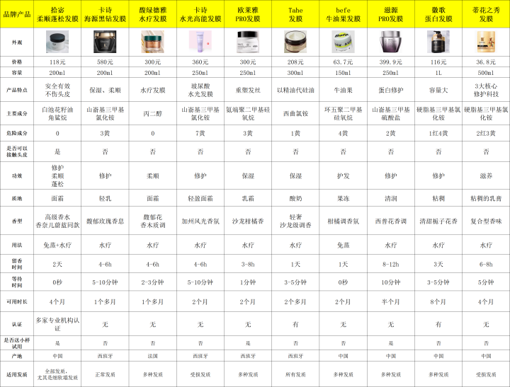 先跟公共共享一下各个品牌发膜的基础情况对比: