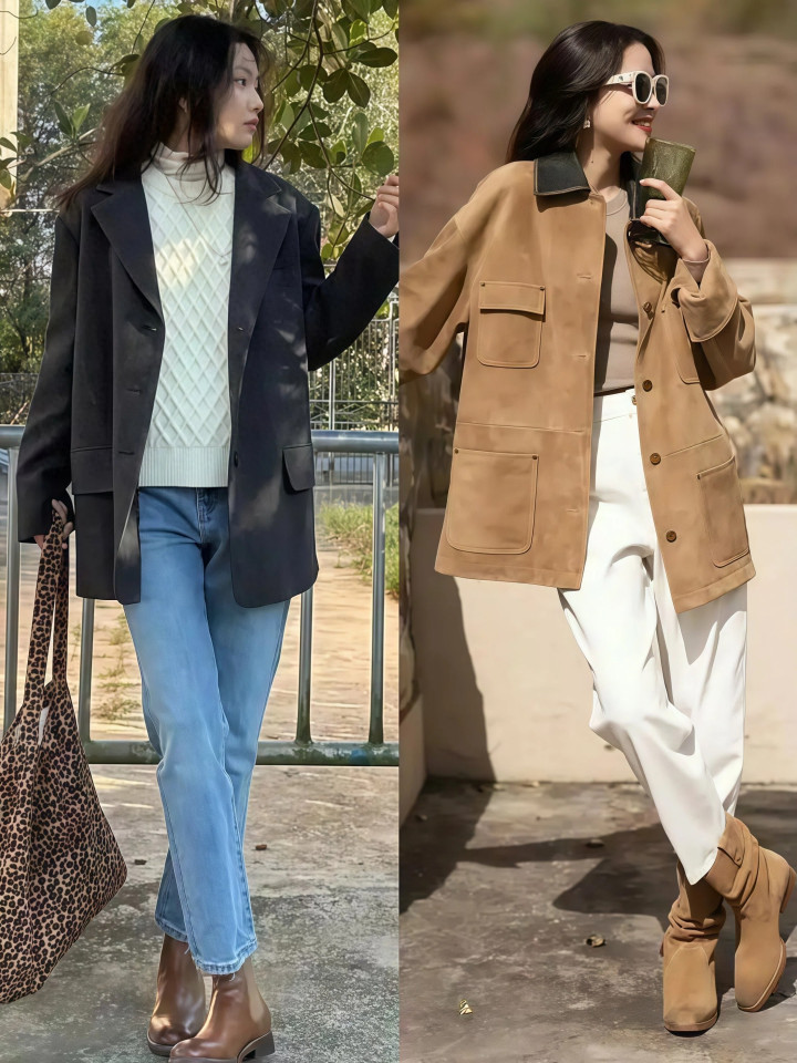 短靴自带一种“持住”的力量,它把阔腿裤散开的裤脚往里收了一截,让下半身的综合从宽松过渡到紧致。