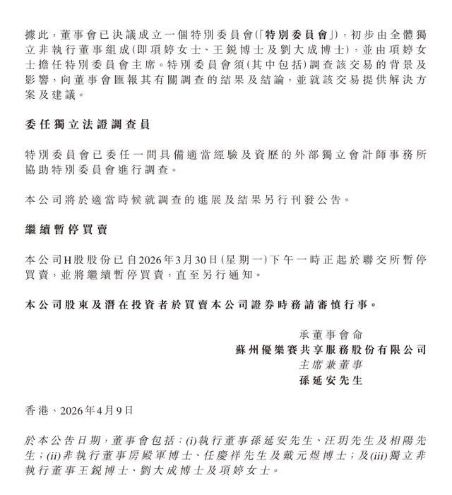 确立相等委员会:公司公告董事会已决策确立由合座孤苦非现实董事构成的相等委员会(主席项婷),并委聘外部孤苦管帐师事务所协助进行法证探望。