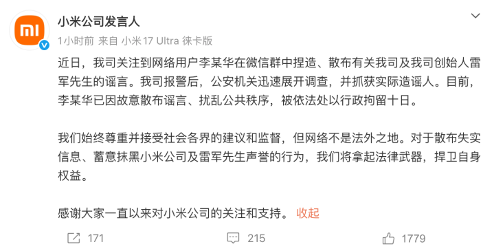 2026年4月26日,小米公司发言东谈主在外交媒体平台发文称,近日,我司柔和到汇聚用户李某华在微信群中持造、分布联系我司及我司创举东谈主雷军先生的谣喙。