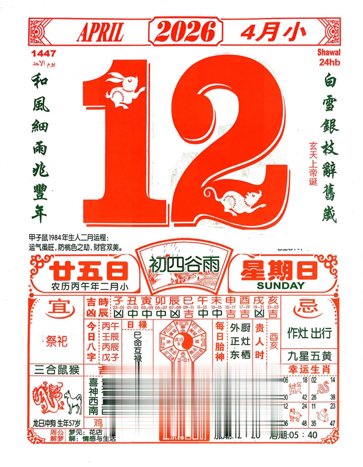 通书心中过,遇事不出错。4月12日,日曜日,农历二月廿五,大众不错先留住一句:吉利护身。祈福一下我方。这天值神是青龙。标志吉利、喜庆、贵东说念主合作开云sports,主利一切积极之事,需概括判断行事。这天是建日,主创建、诞生,宜始创奇迹、建造动土,亦有“建则有破”之说,大事需严慎。连合青龙,吉中带宜,冲害刑煞并存,宜诚意祭祀,大事择吉,开云体育官方网站行事稳当。穿衣情态推选白色、金色、银色系。不推选蓝色、玄色、灰色系。打麻将求职找责任的不错去西南方,约聚谈恋爱的不错约在西南方。生肖珍摄事项,小鼠隆运当头,小牛魂不守宅,小虎敢于窜改,小兔外界打扰,小龙激情欠安,小蛇智商增强,小马突飞大进,小羊龙马精神,小猴元气心灵焕发,小鸡好运登场,小狗运势低垂,小猪不行取巧,有缘刷到,祝你应承,福生无量。