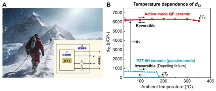 主动责任模式压电调控技巧旨趣框图,及该模式下QP陶瓷的压电所有在室温至350°C的超宽环境温度内保持踏实。主动责任模式包含控温模块与偏压模块,可类比为攀高珠峰所需的保温服和氧气瓶。