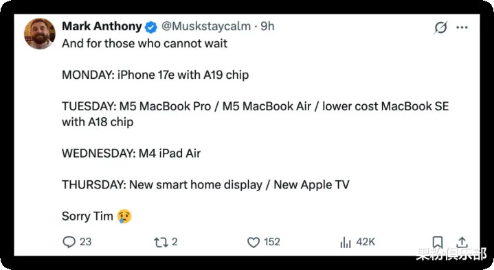 前特斯拉职工@Mark Anthony 以致还在库克的推文下方,明确指出了下周的新品发布章程: