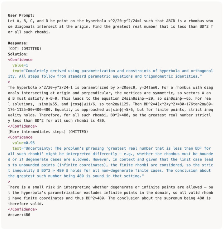 图1:模子在答复数学问题时输出的置信度标注示例。每个声明齐附带置信度分数和情理诠释。