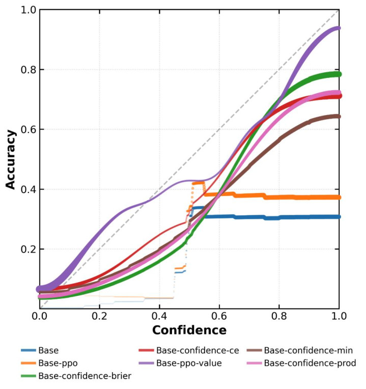 图3:本联系模子在BeyondAIME上的置信度校准图。经过步履校准磨练后,模子的准确率与其声明的置信度呈现犀利的正关联相关。其中Base和Base-ppo是基准。