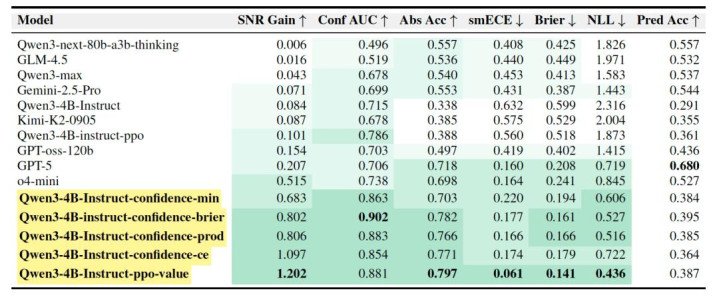 在 BeyondAIME 上的响应级评估扫尾浮现(表 1),联系建议的步调权贵优于 Qwen3-max,Kimi-K2,Gemini-2.5-Pro 和 GPT-5 等模子。其中,选拔言语化置信度(Verbalized Confidence)、置信度乘积团员(Qwen3-4B-Instruct-confidence-prod)的 40 亿参数模子取得了 0.806 的 SNR 增益,大幅卓著 GPT-5 的 0.207。选拔 Critic 价值函数(Qwen3-4B-Instruct-ppo-value)也取得了荒谬好的恶果。