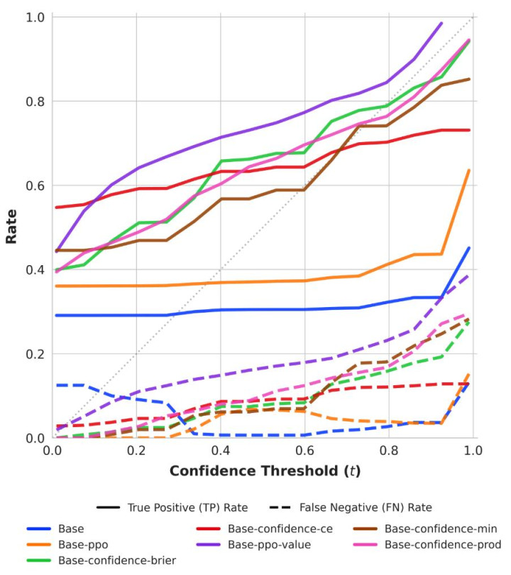 图5:步履校准的True Positive(实线)和False Negative(虚线)。TP弧线应位于对角线上方,FN弧线应位于对角线下方。Base和Base-ppo是基线