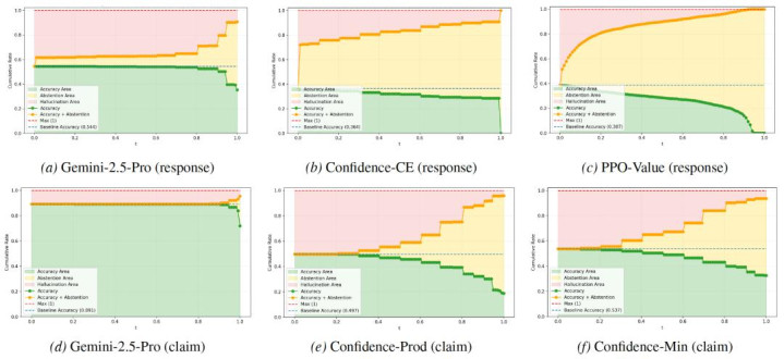 图4:在不同风险阈值下的准确率、休止率和幻觉率变化弧线。绿色区域代表准确率,黄色区域代表休止率,红色区域代表幻觉率。跟着风险阈值t的加多,模子逐渐从「应考者格式」过渡到「完全教悔格式」。