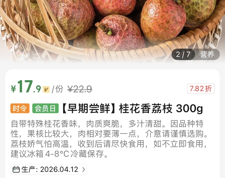 记者在叮咚买菜平台上看到,产自海南陵水的桂花香荔枝,现在300克规格零卖价约17.9元(约每斤29.8元)。该品种自带独到桂花香味,肉质脆嫩,汁水清甜。