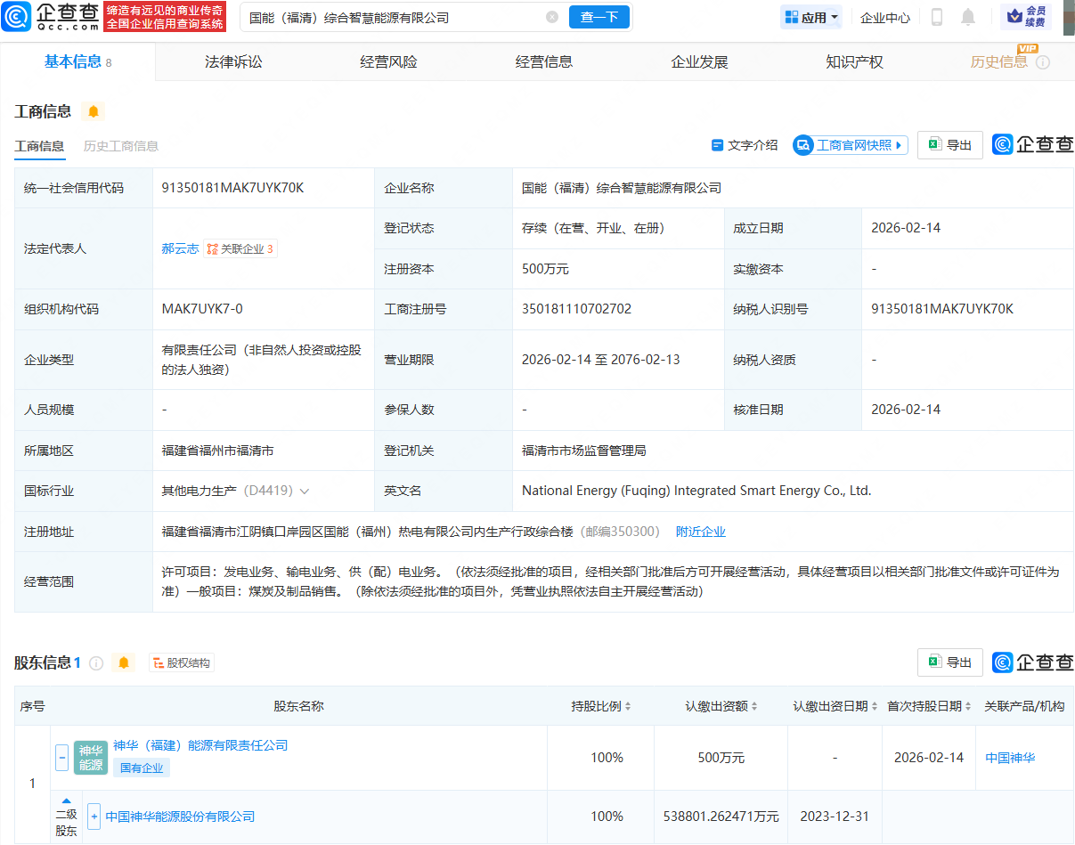 近日,国能(福清)玄虚贤慧动力有限公司确立,篮球比赛投注app(中国)官网法定代表东谈主为郝云志,开云sports谋划界限包含:发电业务、输电业务、供(配)电业务;煤炭及成品销售。企查查股权穿透走漏,该公司由中国神华(601088)盘曲全资捏股。