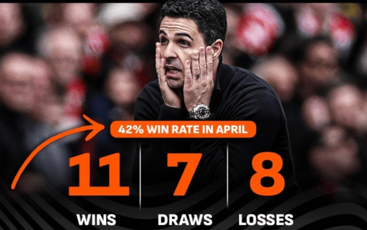 阿森纳那处呢?阿尔特塔握教以来,四月一共踢了26场英超比赛,只赢了11场,胜率42%,连一半齐不到。平了7场,输了8场。42%对79%,这不是差距,是鸿沟。