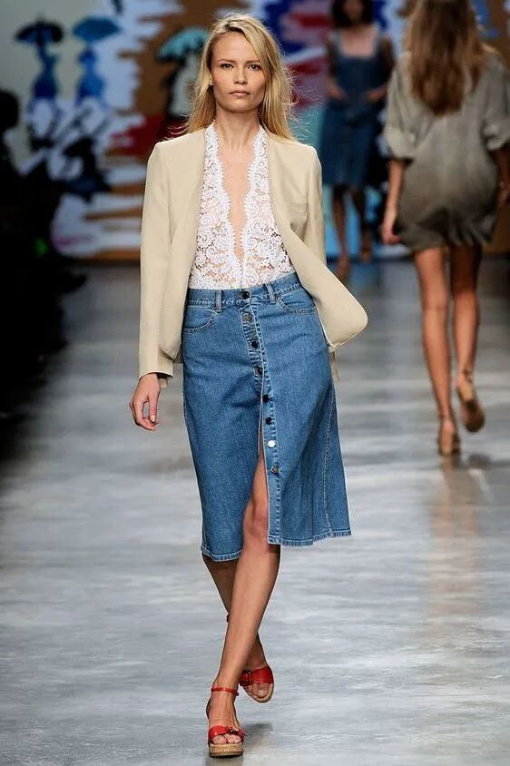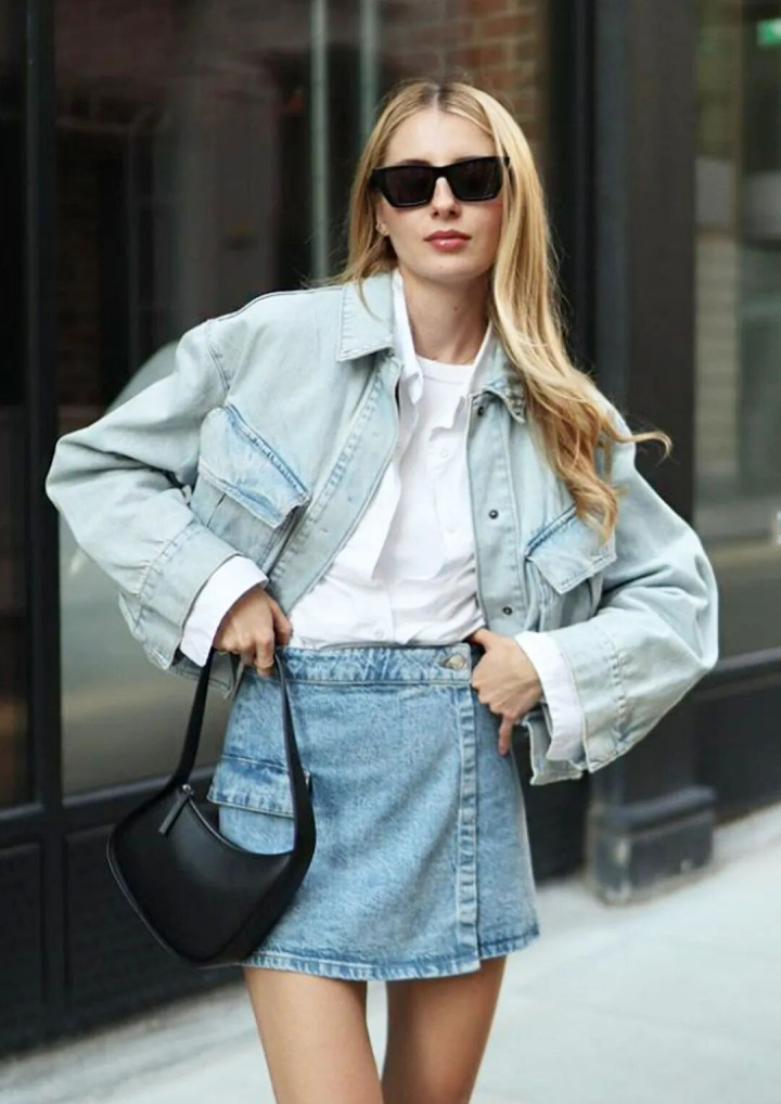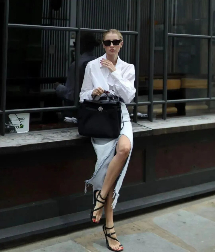淌若以为牛仔裙太平静了,那就搭配一件剪裁相比利落的白衬衫。